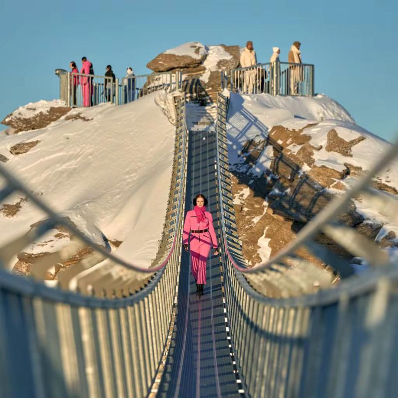 A más de 3.000 metros de altura, Guess presentó su exclusiva Winter Ski Capsule en el impresionante resort Glacier 3000, en Suiza. Este histórico puente colgante sobre los Alpes Suizos sirvió de marco para una colección que no solo destacó por su estilo, sino también por el contexto visual inigualable que lo acompañó. El paisaje invernal de los Alpes, cubiertos de nieve, fue el escenario perfecto para una propuesta que evoca la elegancia del estilo après-ski, popular en las décadas de los 50 y 60, cuando el esquí comenzó a desarrollarse como deporte en la región.