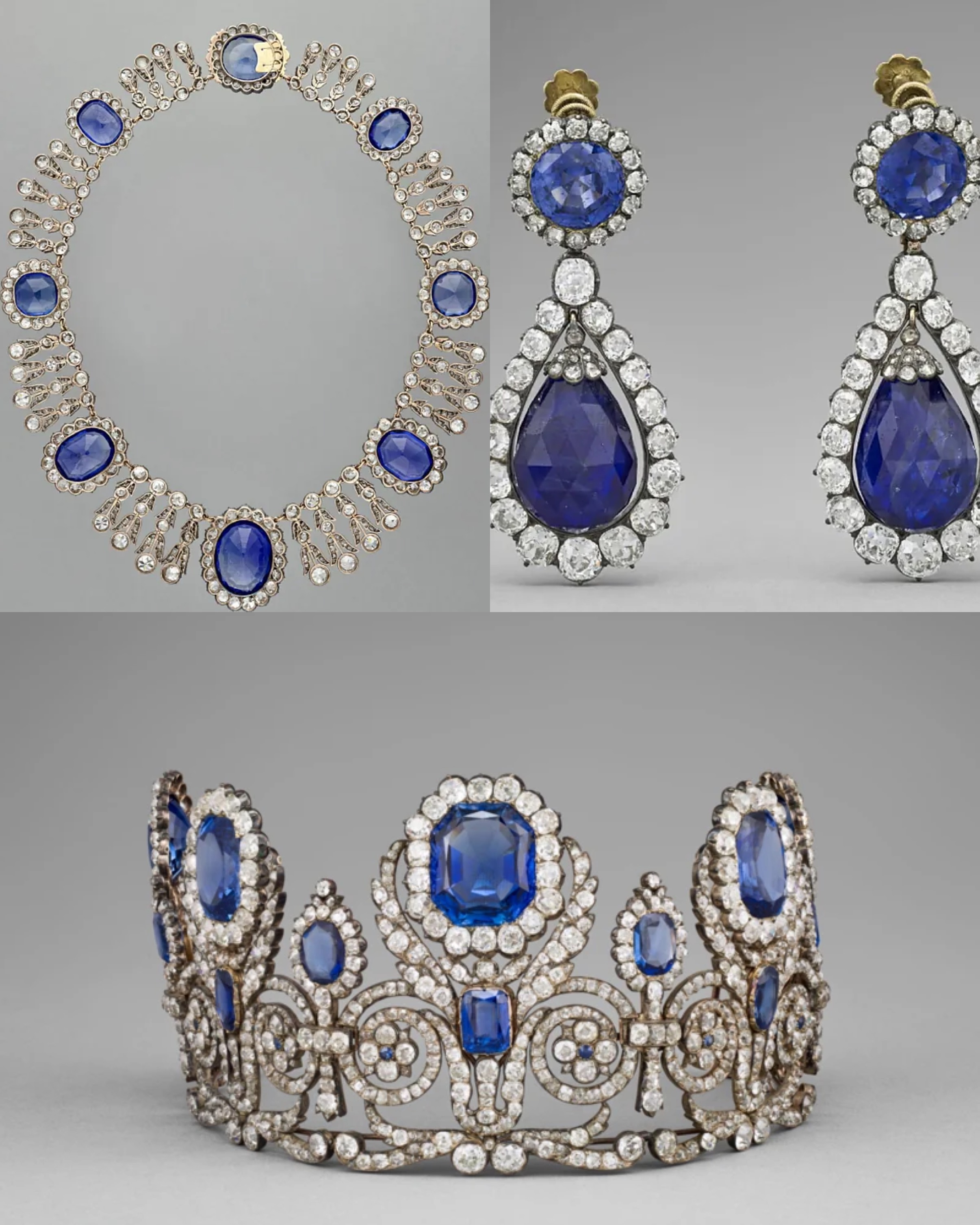 Juego de joyas de las reinas María Amelia y Hortensia, que incluye tiara y collar de zafiros.