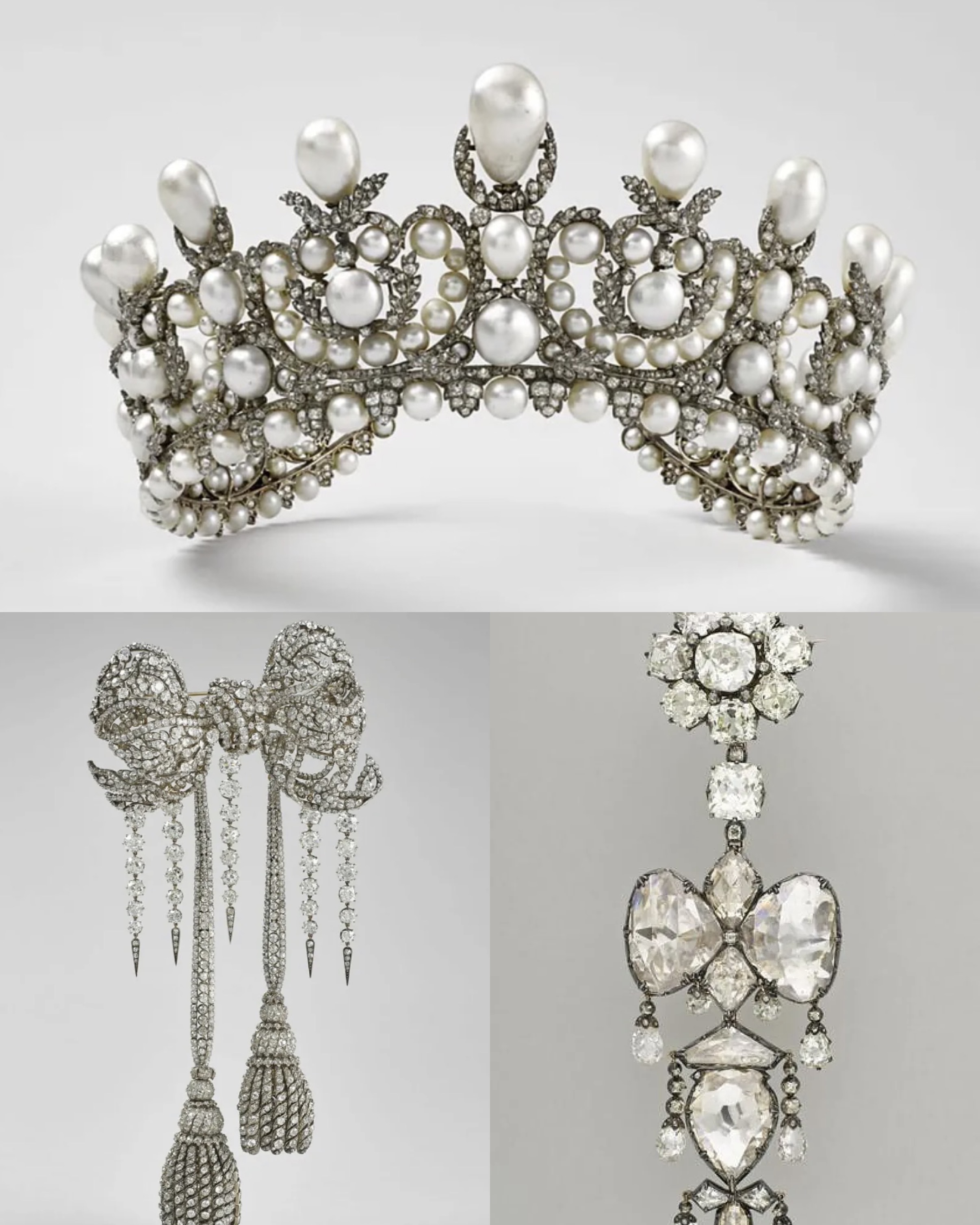 Diadema de perlas, broche-relicario, broche en lazo y tiara de diamantes pertenecientes a la emperatriz Eugenia (esposa de Napoleón III).